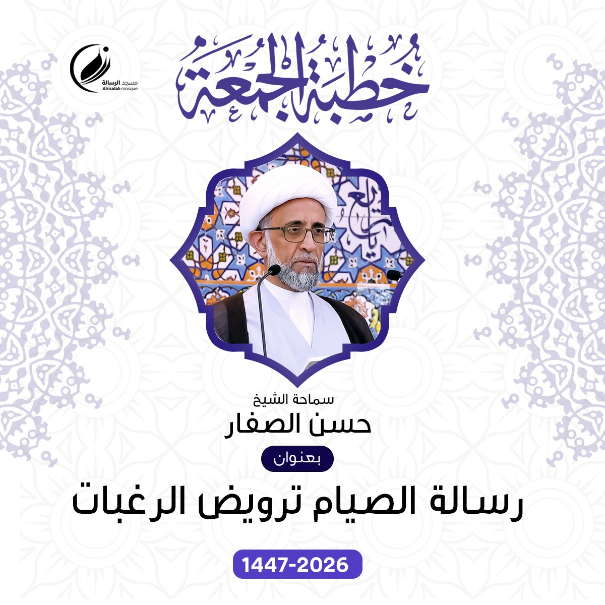 جاء ذلك ضمن خطبة الجمعة 3 رمضان 1447هـ الموافق 20 فبراير 2026م، في مسجد الرسالة بالقطيف شرقي السعودية بعنوان: رسالة الصيام ترويض الرغبات.